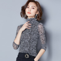 珂依舍2017秋装新款新款韩版小高领印花修身网纱打底衫大码女上衣