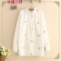 锦铭七玥春秋装新款2018长袖甜美木耳领刺绣花朵棉中长款白色衬衫女上衣