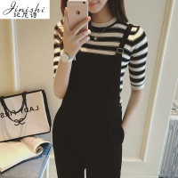 YIBUSHENG大码休闲背带针织连衣裙女装季撞色短袖t恤裙胖MM梨形身材裙子