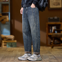 垂坠感锥形牛仔裤男 做旧蓝水洗 侧缝明线设计 美式复古卷边长裤
