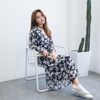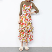 精品女装2018秋季新款韩版印花吊带连衣裙荷叶边长裙子CYLLJQFS