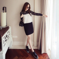 顺崇2018胖MM春季新款韩版长袖蕾丝拼接撞色大码女装连衣裙圆领显瘦女短裙