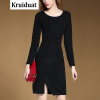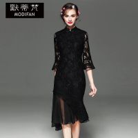 默蒂梵欧美女装2017春夏中长款蕾丝拼接包臀裙修身显瘦连衣裙黑色