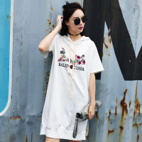 莞馨连衣裙2017年夏季连帽短袖植物花卉印花字母街头简约优雅气质