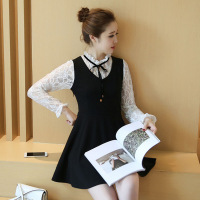 薇侣2017新品新款修身假两件套连衣裙长袖拼接蕾丝大摆裙