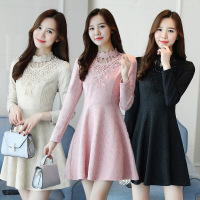 薇侣2017女装秋冬新款韩版蕾丝修身显瘦加厚长袖女连衣裙