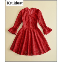 Kruidvat2017春夏新款女装修身蕾丝镂空喇叭袖V领绣花连衣裙B064红色