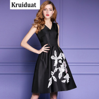 Kruidvat连衣裙女夏2017新款V领高腰蕾丝绣花黑色