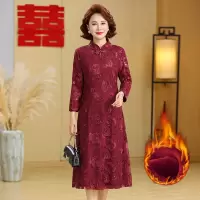 秋冬妈妈装蕾丝加绒旗袍连衣裙女中老年保暖立领刺绣气质裙枣红色