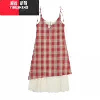 YIBUSHENG红色假两件格纹蕾丝吊带连衣裙女季海边度假风设计感小众长裙子