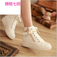 锦铭七玥2017春季韩版高帮帆布鞋女 甜美内增高魔术贴 休闲单鞋学生小白鞋
