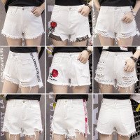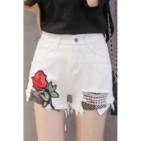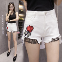 薇侣2017牛仔白色短裤女夏韩版新款潮流宽松毛边破洞玫瑰花刺绣超短裤