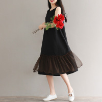 胖mm夏装新款文艺大码宽松棉麻拼接网纱无袖背心连衣裙打底长裙女