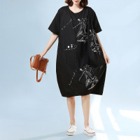 夏装新款文艺范大码不规则印花胖MM200斤宽松显瘦遮肚子连衣裙女