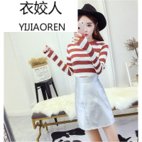 衣姣人2018秋冬新款条纹针织手套上衣+时尚潮流银色洗水Pu裙套装