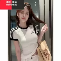 YIBUSHENG三木子自制 条纹正肩短袖t恤女装季辣妹修身显瘦白色体恤短上衣