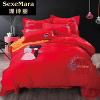 珊诗丽大红色卡通刺绣喜庆婚庆四件套结婚礼物双人床上用品绣花床单被套