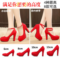 粗跟婚鞋女夏季水钻绑带中跟防水台结婚红鞋新娘鞋红色高跟鞋单鞋