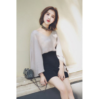 2017新款不规则喇叭袖V领长袖T恤+修身显瘦纯色高腰短裤