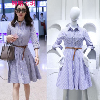 锦铭七玥2018春季明星纽约时装周机场杨幂同款蓝色条纹中长款衬衫裙连衣裙