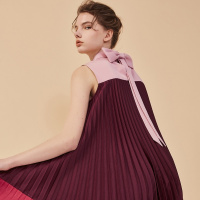 奥芝国 少女拼色 垂坠时装面料大蝴蝶结无袖宽松百褶娃娃裙连衣裙