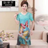 默蒂梵2017夏装新款中年女士宽松大码连衣裙妈妈装V领短袖印花长裙