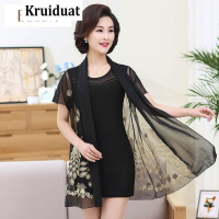 Kruidvat2017夏装新款中年女装宽松大码妈妈装圆领真两件套绣花休闲披肩