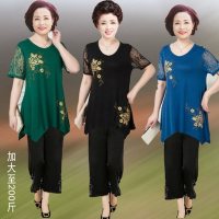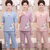 中老年女装妈妈装夏季棉麻套装中年女夏装女40-50岁2018夏新款中年女装短袖上衣老人衣服绣花T恤九分裤奶奶装两件套