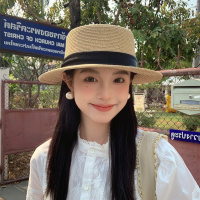 夏季法式平顶草帽草编礼帽大檐太阳帽海边度假遮阳帽新款防晒帽子
