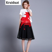 Kruidvat2017夏季新款女装欧美棉金鱼绣花短袖T恤+网眼大摆半身裙套装图片色