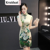 奈琴尔2017春夏新款短款丝绸立领开衩改良旗袍连衣裙K86图片色