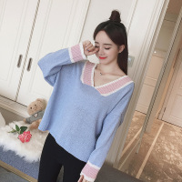 薇侣2017新品学院风毛衣女套头宽松秋冬蝙蝠型韩版学生v领长袖针织衫