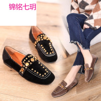 锦铭七玥女2018春季新款绒面单鞋舒适铆钉低帮鞋复古方头扣饰平底鞋