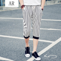 夏季斑马竖条纹七分裤男休闲裤运动修身小脚哈伦裤韩版潮流67分裤