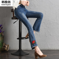韩雅俏(HANYAQIAO)2018新品春季新款刺绣喇叭裤女九分裤显瘦修身高腰微喇裤