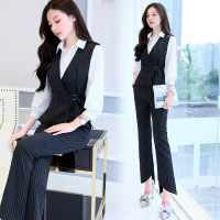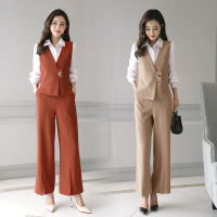 莞馨秋季新品翻领长袖纯色衬衫+阔腿裤时尚三件套马甲套装