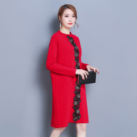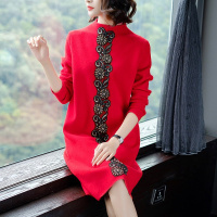秋冬款高领长袖刺绣针织连衣裙中长款冬季打底女毛衣裙加厚红色