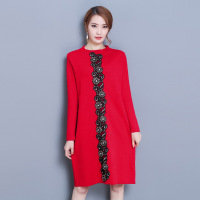 欧洲站秋冬款高领长袖刺绣针织连衣裙中长款冬季打底女毛衣裙加厚红色