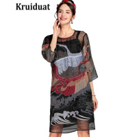 Kruidvat2017春女装真丝中袖中长款开衫欧根纱绣花连衣裙ZY