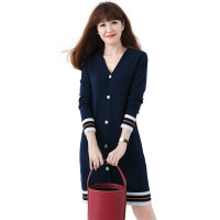 针织衫女V领开衫系扣修身加厚羊毛裙秋冬新女毛衣中长款山羊绒衫藏蓝