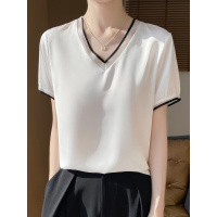 2025夏季女新短款宽松v字领拼色网纱短袖T恤缎面薄款半袖女士上衣