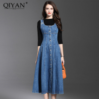 2017秋季新款女装潮牛仔打底吊带背心连衣裙背带裙时尚修身中长款大裙摆百褶裙牛仔蓝