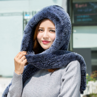 兔毛围巾帽子女冬季獭兔毛编织皮草帽子围巾连体护耳保暖韩版潮藏青色均码