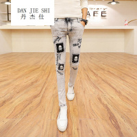 graceinla欧美风钉珠牛仔裤女磨白水洗小脚铅笔裤修身显瘦中低腰绣花牛仔长裤女潮JNW-5946