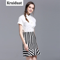 Kruidvat2017春夏新款通勤风翻领短袖女士衬衣条纹半裙套084白色