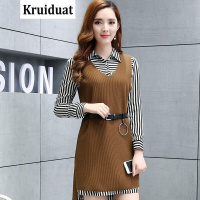 Kruidvat2017春装两件套连衣裙女条纹衬衣领气质韩范长袖套装女小香风Z032