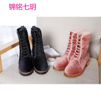 锦铭七玥马丁靴女圆头靴子女2017新款显瘦粗跟短靴绑带雪地靴短筒机车靴女