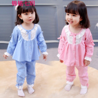 锦铭七玥可爱娃娃衫睡衣套装2018春秋新女童中小童棉花边居服