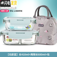 三维工匠微波炉饭盒套装学生分隔玻璃加热碗保鲜盒上班族保温便当餐盒日式 [北欧蓝]长410+两隔长680+米色天鹅包