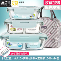三维工匠微波炉饭盒套装学生分隔玻璃加热碗保鲜盒上班族保温便当 [北欧蓝]长410+两隔长680+三隔长1000+包+餐具